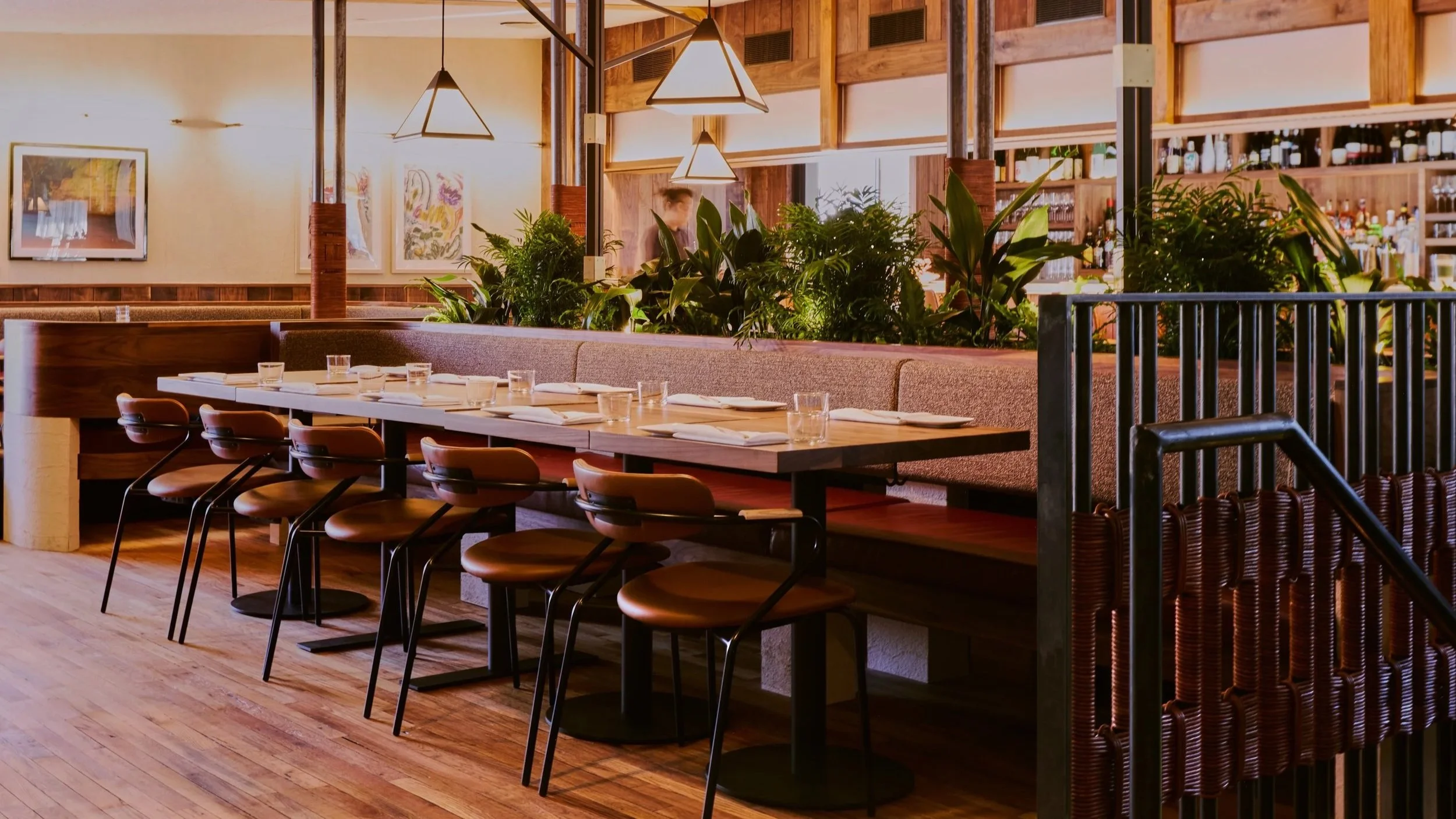 The space leans heavily into warm wood tones, layered lighting, and integrated architectural elements that create separation without fully closing off each area. The result is a series of connected rooms that allow for different dining formats while maintaining a consistent visual identity throughout the space.